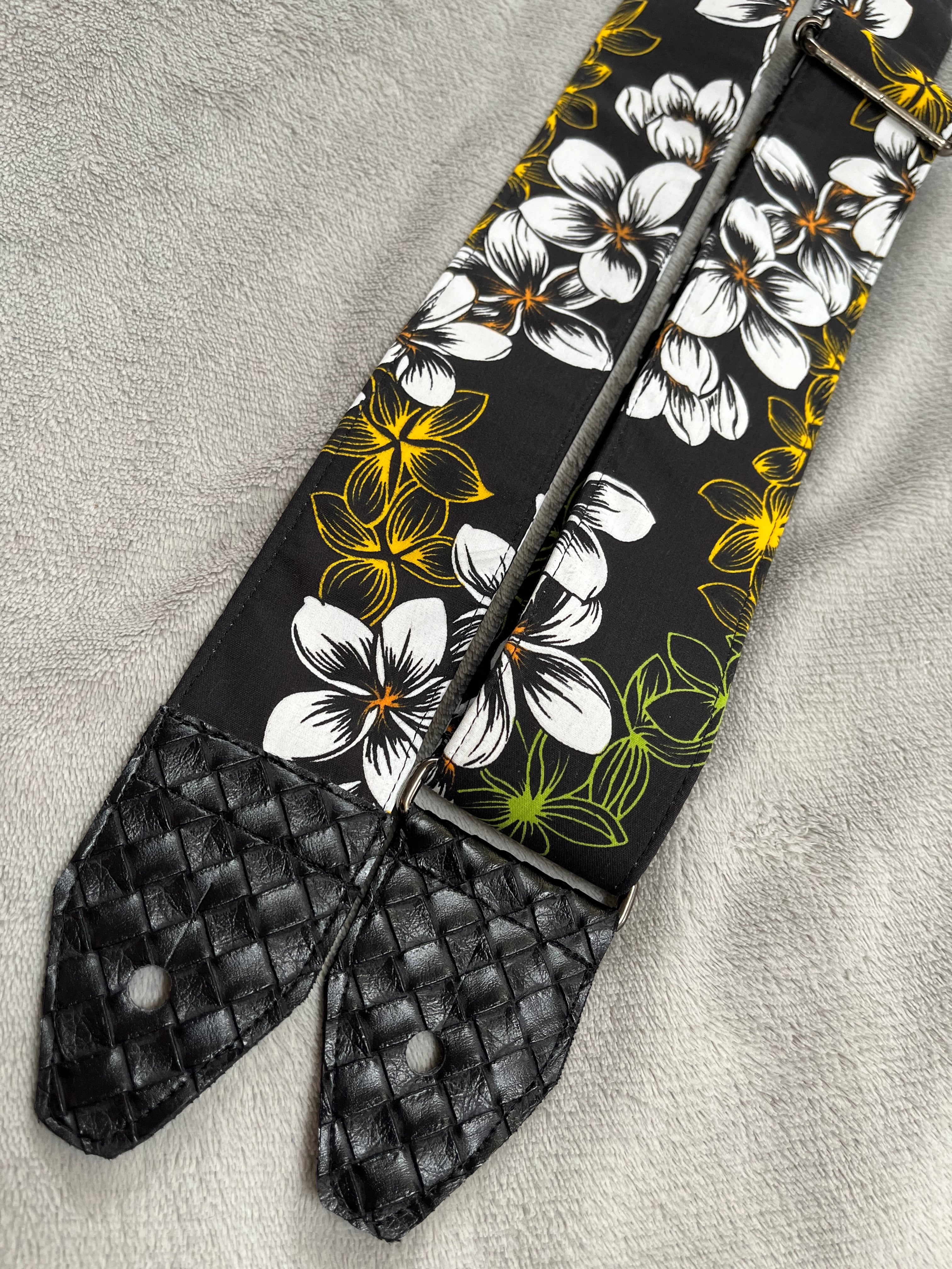 黒地白プルメリギターストラップ・5センチ幅
