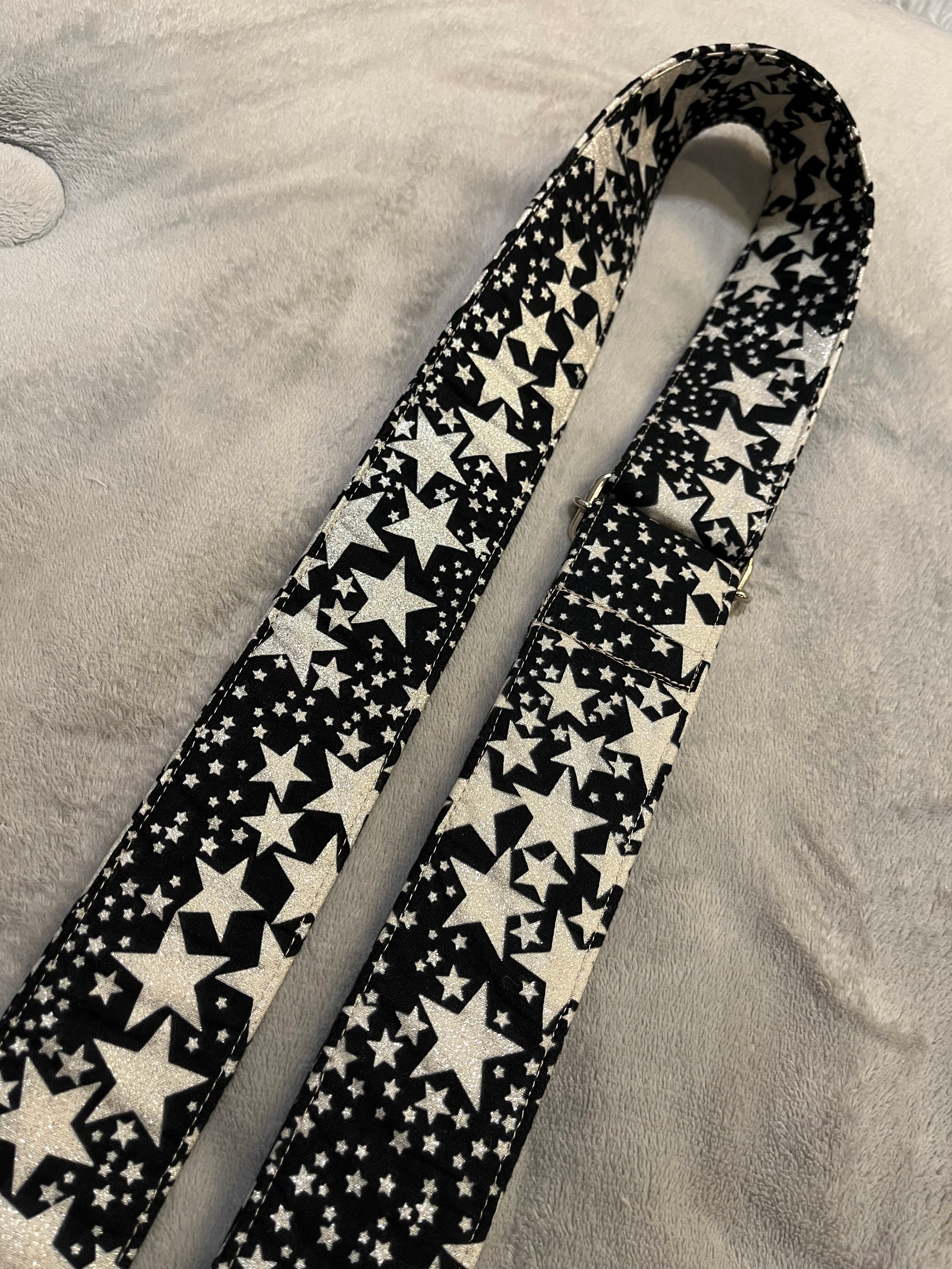 大人気!黒地に銀色のキラキラ★スター柄のギター・ベース・ウクレレ用 ストラップ・5センチ幅です。